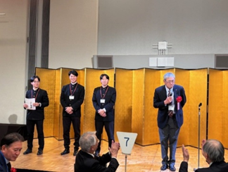 午後5時30分より懇親会が行われ、森山泰充実行委員長のご挨拶、来賓紹介の後、千葉県支部名誉顧問・松平武史氏が乾杯の発声を務められました。歓談の時間では、各稲門会同士の交流が深まり、終始温かな雰囲気に包まれました。懇親会の中では、遅れて到着された熊谷俊人千葉県知事よりご挨拶があり、参加者から大きな拍手が寄せられました。懇親会には、特別来賓として早稲田大学野球部より小宮山悟監督とドラフト指名を受けた伊藤樹投手・田和廉投手、マネージャーの4名が参加しました。小宮山監督からは千葉県支部への温かなメッセージが寄せられ、学生からは日頃のご声援への御礼とともに、来年2月に予定されている第14回米国遠征のクラウドファンディングへの協力依頼がありました。また、早稲田大学応援部による校歌・応援歌の演奏が披露され、会場が一体となる力強い時間となりました。