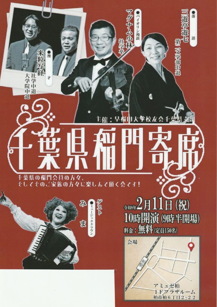 校友会千葉県支部では、組織委員会主催で「千葉県稲門寄席」を次のとおり